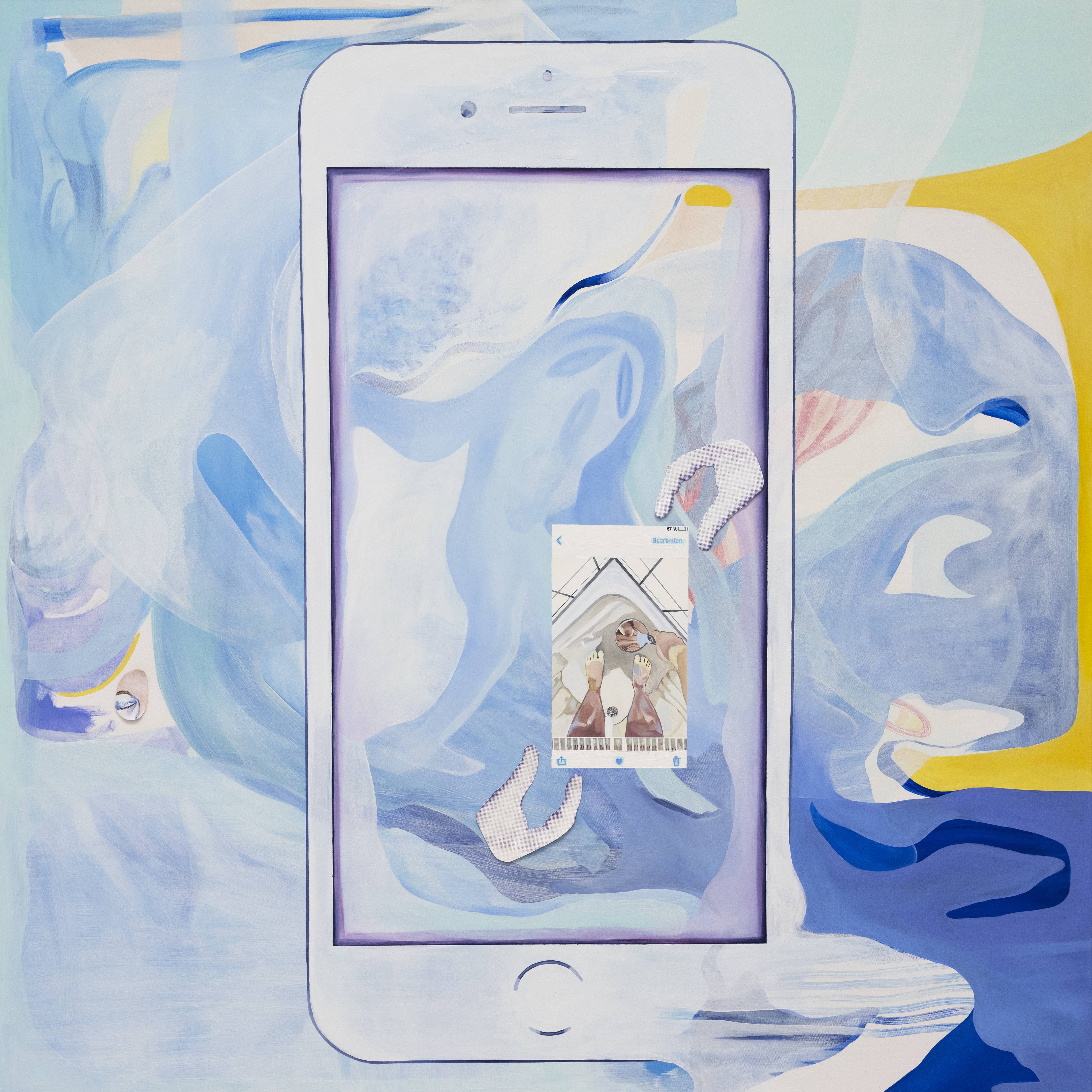 In this ongoing series I explore my body using my cellphone-camera. The phone, almost being a body part, becomes the tool of my body-exploration while also serving as the image-carrier of my paintings. Oberdimensioned to scale the cellphone looses its handy, cute size. Larger than life, it stands monumentally in the room, laning on a wall or laying on the ground. The cellphone monstrously engulfes its surroundings. The proportions between user and phone reverse, mirroring the overwhelming control of the device over its users. My research challenges digital body-ideals and the norms of the Social-Media-World. By revealing my inner doubts on canvas, I reconquer the authorship of my body by painting my personal shadow, thus revealing and embracing it. Out of this self-portrayal a surreal mirror-image of „soul-body“ and „body-soul“ emerges.
