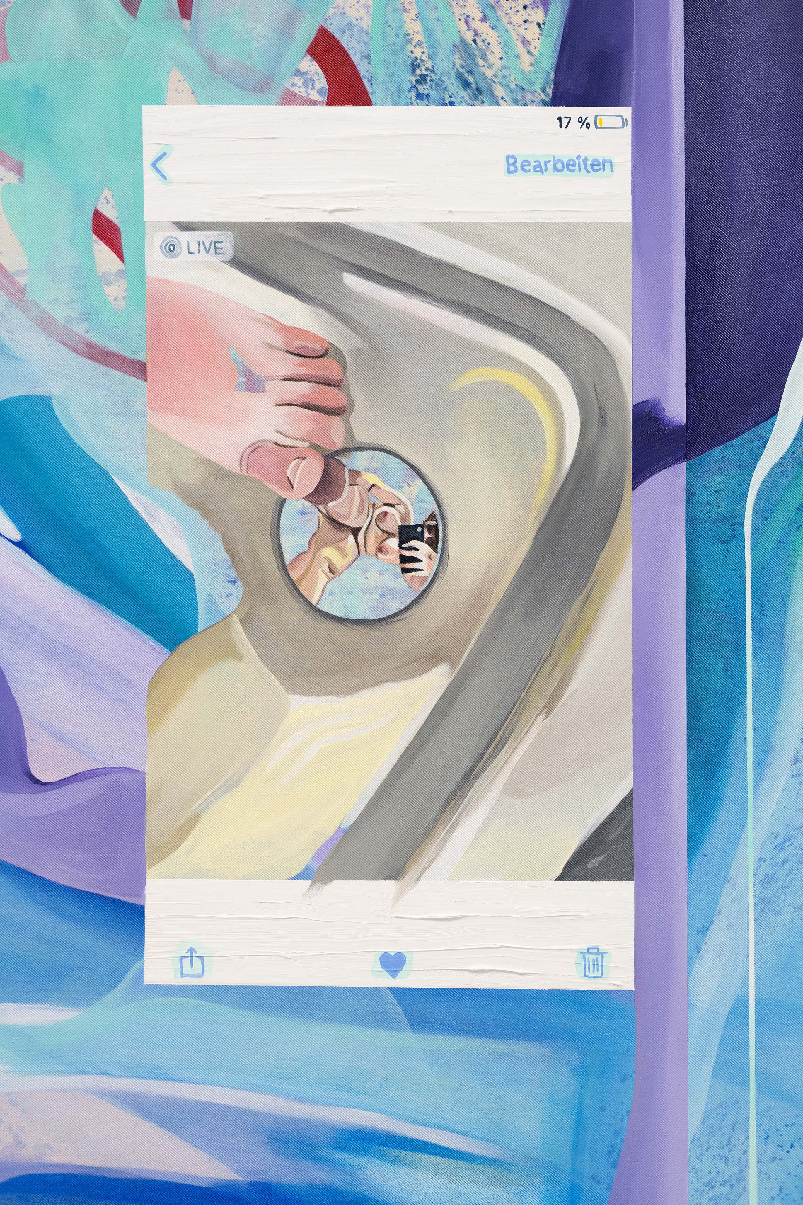 Mit dem Pinsel in meiner Hand nehme ich einen analogen Zugriff auf technoide Welten, bediene mich der Form des iPhones und gebe ihm einen persönlichen Ausdruck. Die Farbpalette konzentriert sich auf Blau-, Grün-, Rot-, Violett- und Fleischtöne. Dieses Farbrepertoire repräsentiert die kühle, künstliche Atmosphäre, die das Bildschirmlicht im Zusammenspiel mit Fleisch und Haut bewirkt. Einige Spiegelbilder befinden sich im Fenster des Screenshot, der im offenen Bildraum schwebt. Details wie Entstehungsort, Akkustand und Icons bleiben erkennbar oder lösen sich in der surrealen Umgebung auf. Andere Selfies haben sich aus den Screenshots befreit und finden ihren Platz in geschlossenen, sicheren, runden Formen eines Duschkopfes oder Abflussstöpsels. Durch die bewusste und spielerische Setzung in die Malerei verlieren die Formen ihren realen Ursprung und ersetzen den Home-Button oder die Handykamera. Der Kreis nimmt die Gestalt einer Lupe oder eines Handspiegels an. Mein Selfie tanzt wie ein Spielball über die Leinwand. Das Selfie nimmt Raum, integriert sich in das iPhone und verdrängt seine Funktionen. Die Icons blinken in den Motiven auf, klein und hintergründig wie Tätowierungen auf der Bildhaut. Diese einflussreiche Macht, die mit einem Klick Information löscht, Likes vergibt, Bilder fälscht, idealisiert, das Selbstwertgefühl stärkt oder schwächt, unterwerfe ich im bildnerischen Prozess meinen Motiven. Fließende, lasierende und diffuse Formen durchdringen die Leinwände gleich einer Bilderflut. Sie nehmen große Flächen des Bildes ein und lassen Trugbilder von Körperteilen, unbekannten Wesen und Gesichtern aus dieser Flut auftauchen. Die Selfies verwandeln sich jenseits von Zeit und Raum in neue Sichtweisen meiner Person und beginnen eine eigene Erzählung meiner Identität. In diesem Sinne begab ich mich in meiner Arbeit auf eine Reise zu mir selber. (Julie Batteux, 2023)
