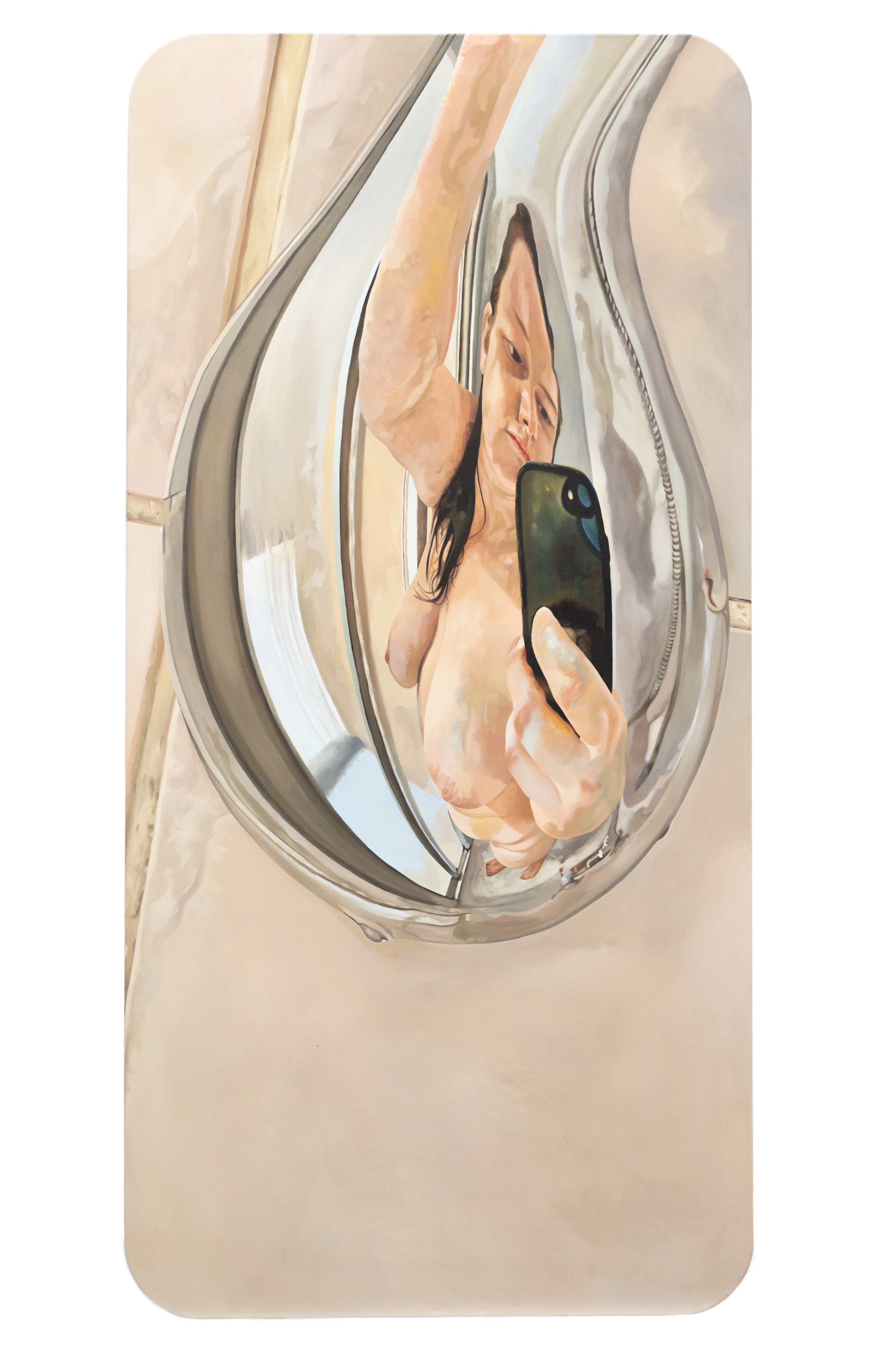 In dieser noch fortlaufenden Serie erforsche ich meinen Körper im Spiegel meiner Handykamera. Das Handy, fast schon menschliches Körperteil, wird zum Werkzeug meiner Körperforschung und dient zugleich als Bildträger meiner händischen Malerei. Maßstabgetreu überdimensioniert verliert das Handy seine handhabbare, niedliche Größe. Übermenschengroß steht es monumental frei im Raum, lehnt an einer Wand, oder liegt auf dem Boden. So nimmt das Handy monströs seine Umgebung in Beschlag. Das Größenverhältnis zwischen Nutzer:innen und iPhone kehrt sich um und spiegelt installativ die übermächtige Herrschaft des Gerätes über seine Besitzer:innen. Meine Recherche hinterfragt die digitalen Körperideale und Normen der Social Media-Welt. Ich erobere mir malerisch die Autorenschaft über mein Körperbild zurück, indem ich meine intimen Selbstzweifel und Körperängste auf der Leinwand offenbare, meinem persönlichen Schatten begegne, ihn enthülle und mir zu eigen mache. Aus dieser Selbstdarstellung entpuppt sich ein surreales Spiegelbild von Seelenkörper und Körperseele. Körperlichkeit und Emotionalität verschmelzen in diesem Prozess und bedingen sich gegenseitig.