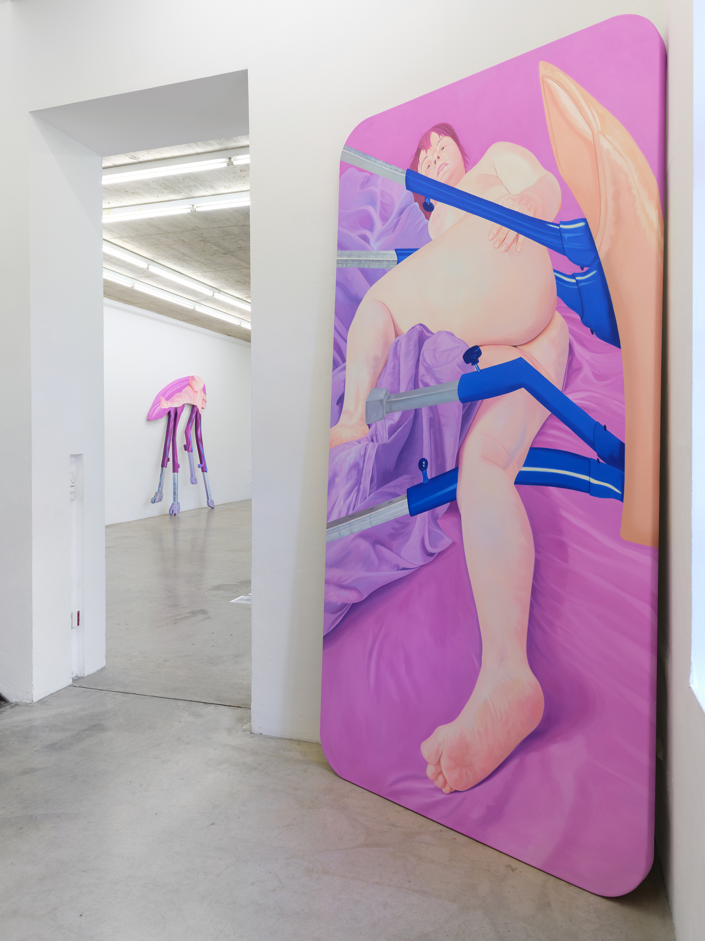 Detail view “Leibeigen”, Kunstverein Kohlenhof, 2023, “Kopfüber #2”, oil on canvas, 220 x 77 cm (86,6 x 30,3 in), 2023, © photo: Julie Batteux