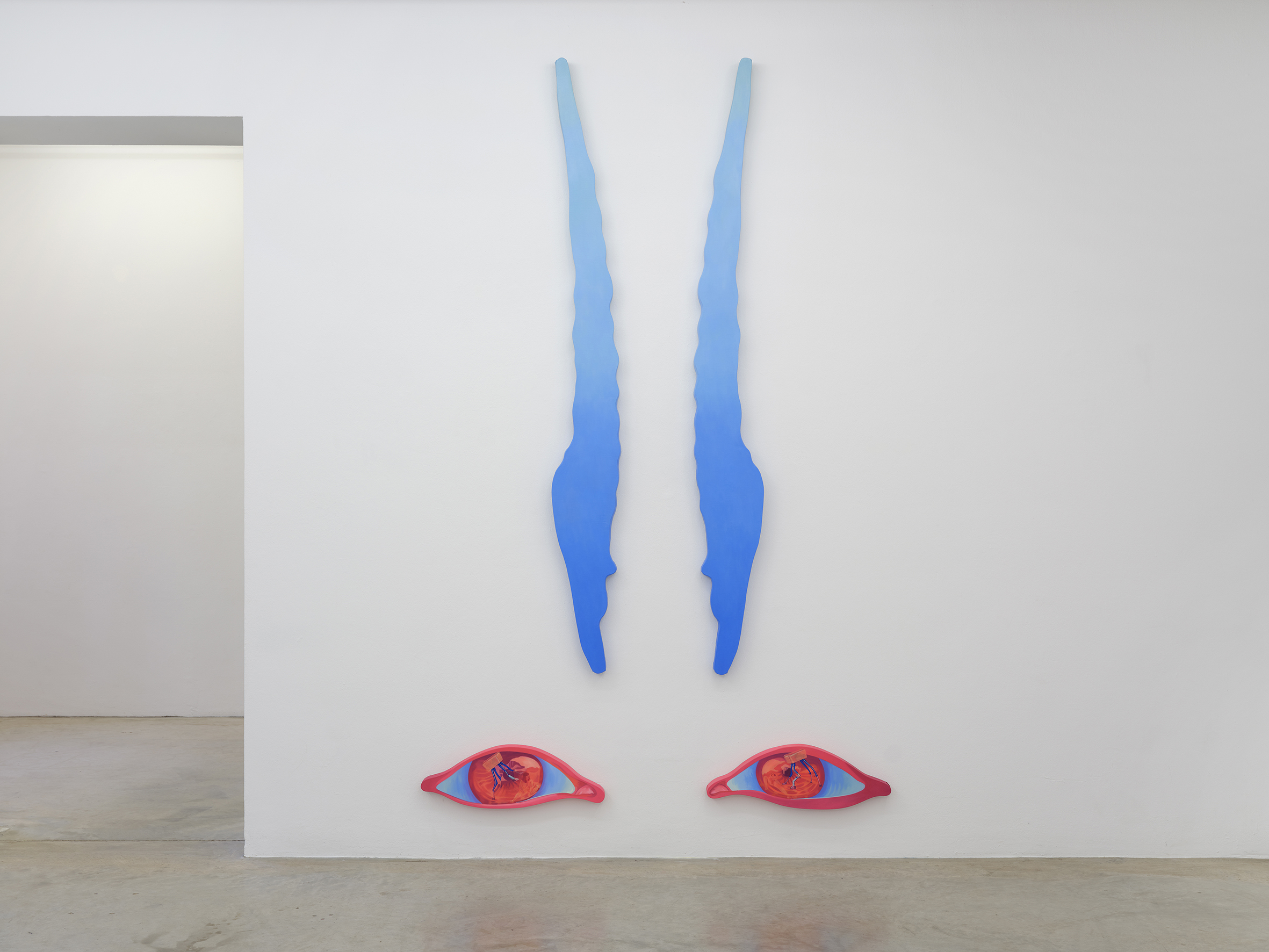 Exhibition view “Layers in Complexity”, NAK Neuer Aachener Kunstverein, 2025, “Im Auge des Bock´s” (from the series “Schattenbock(sen))”, oil on canvas, 240 x 50 cm (94,4 x 19,6 in) (2 pcs.), 23 x 69 cm (9,0 x 27,1 in) (2 pcs.), 2025, © photo: Simon Vogel