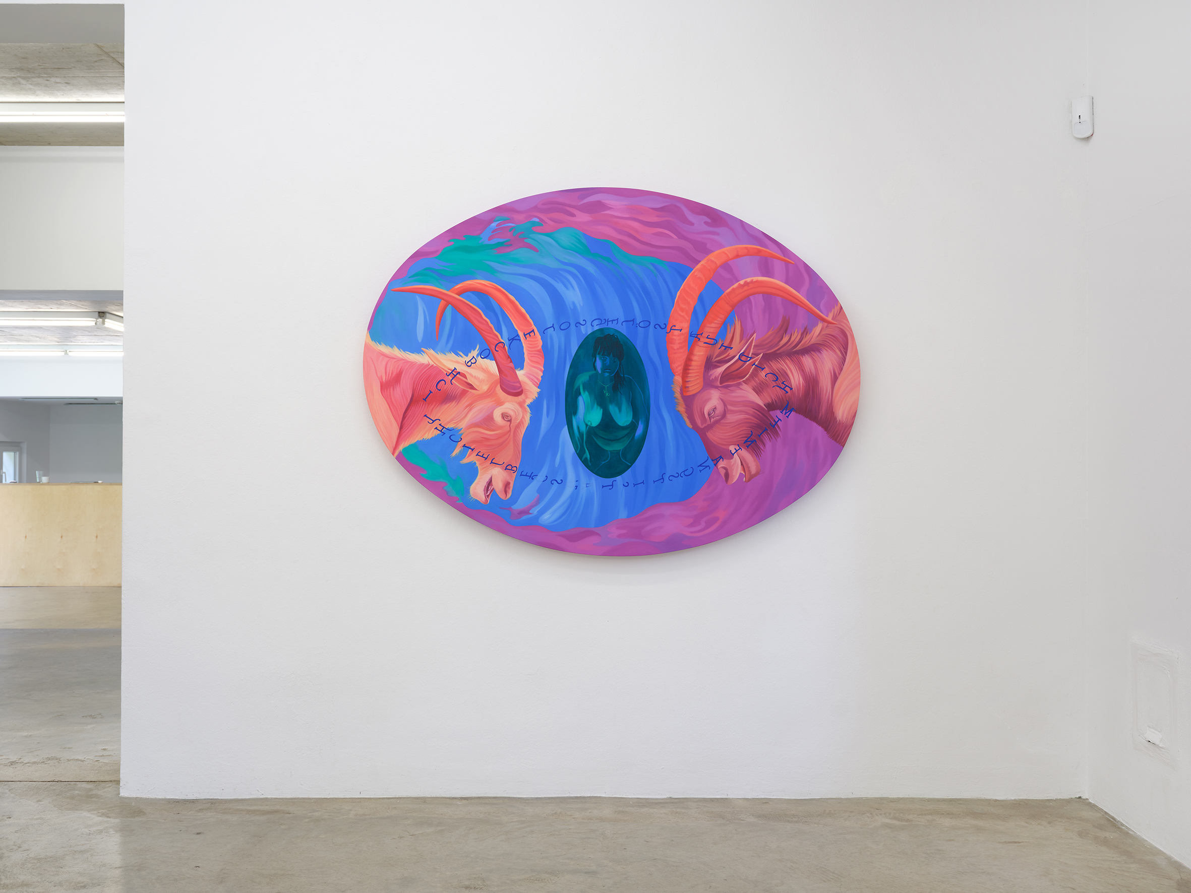 Exhibition view “Layers in Complexity”, NAK Neuer Aachener Kunstverein, 2025, “Bockiges Duell” (from the series “Schattenbock(sen))”, oil on canvas, 130 x 175,5 cm (51,1 x 69,0 in), 2025, © photo: Simon Vogel