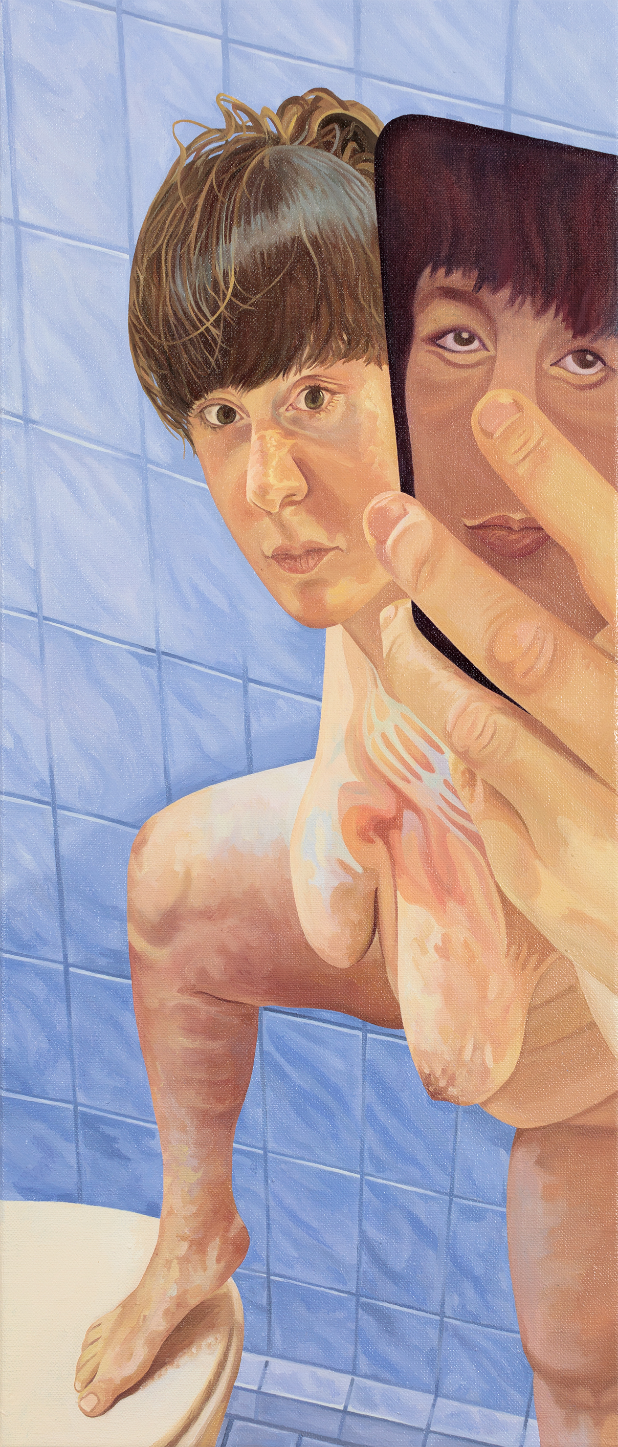 In this ongoing series I explore my body using my cellphone-camera. The phone, almost being a body part, becomes the tool of my body-exploration while also serving as the image-carrier of my paintings. Oberdimensioned to scale the cellphone looses its handy, cute size. Larger than life, it stands monumentally in the room, laning on a wall or laying on the ground. The cellphone monstrously engulfes its surroundings. The proportions between user and phone reverse, mirroring the overwhelming control of the device over its users. My research challenges digital body-ideals and the norms of the Social-Media-World. By revealing my inner doubts on canvas, I reconquer the authorship of my body by painting my personal shadow, thus revealing and embracing it. Out of this self-portrayal a surreal mirror-image of „soul-body“ and „body-soul“ emerges.